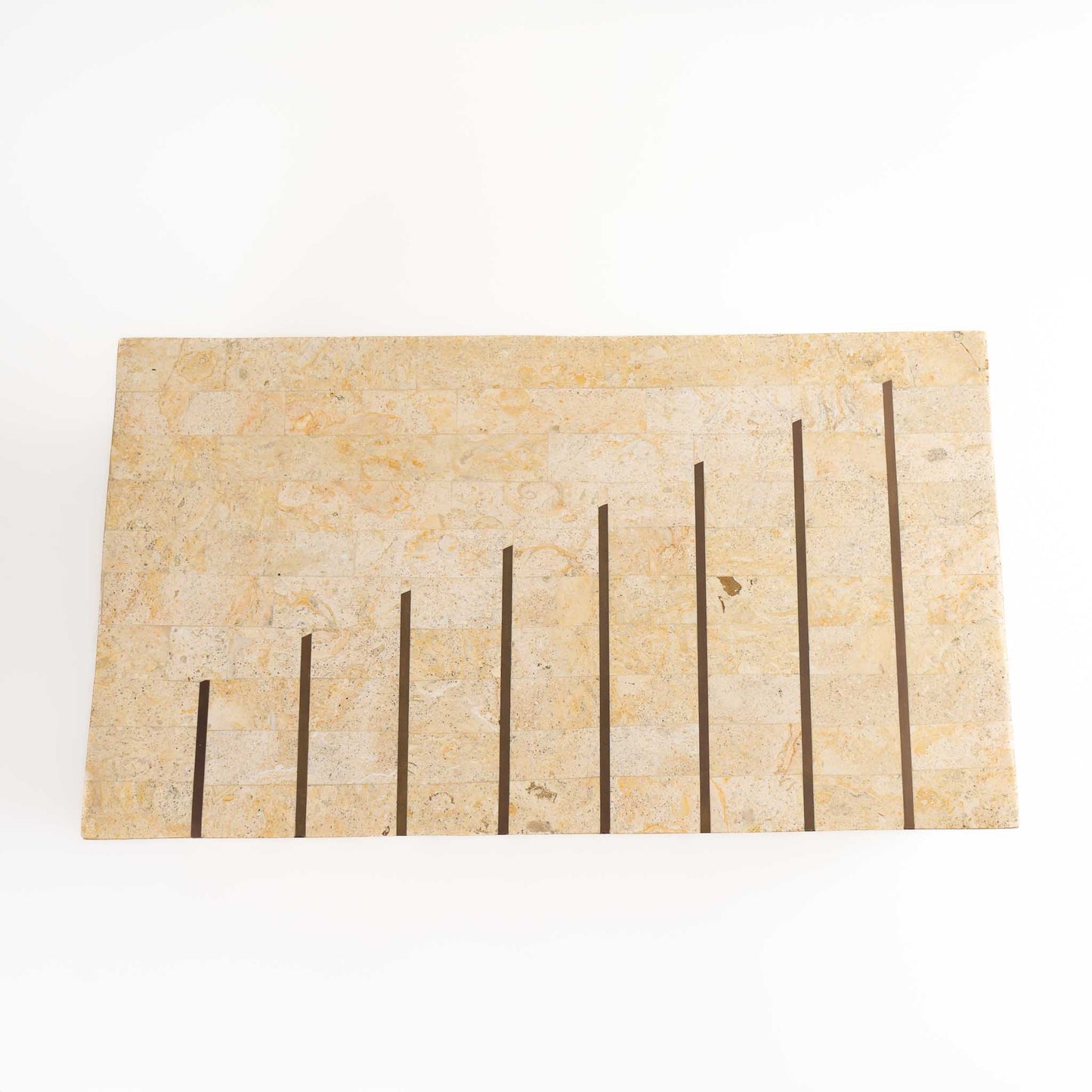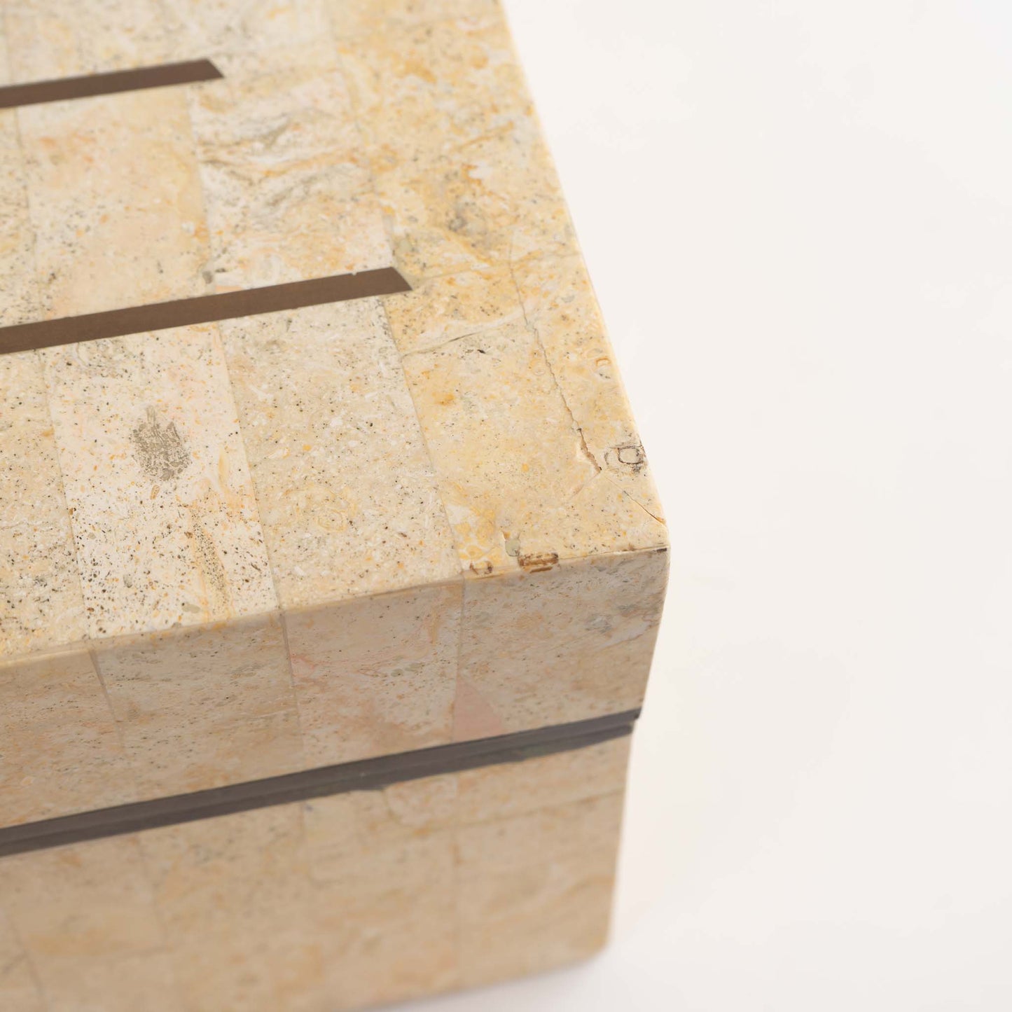 Exquisite vintage Maitland Smith tessellated stone box featuring intricate brass inlay work and a hinged lid that opens to reveal a warm wood interior. This sophisticated piece combines natural stone artistry with luxurious brass detailing, perfect for storing jewelry, treasures, or as a stunning decorative accent.