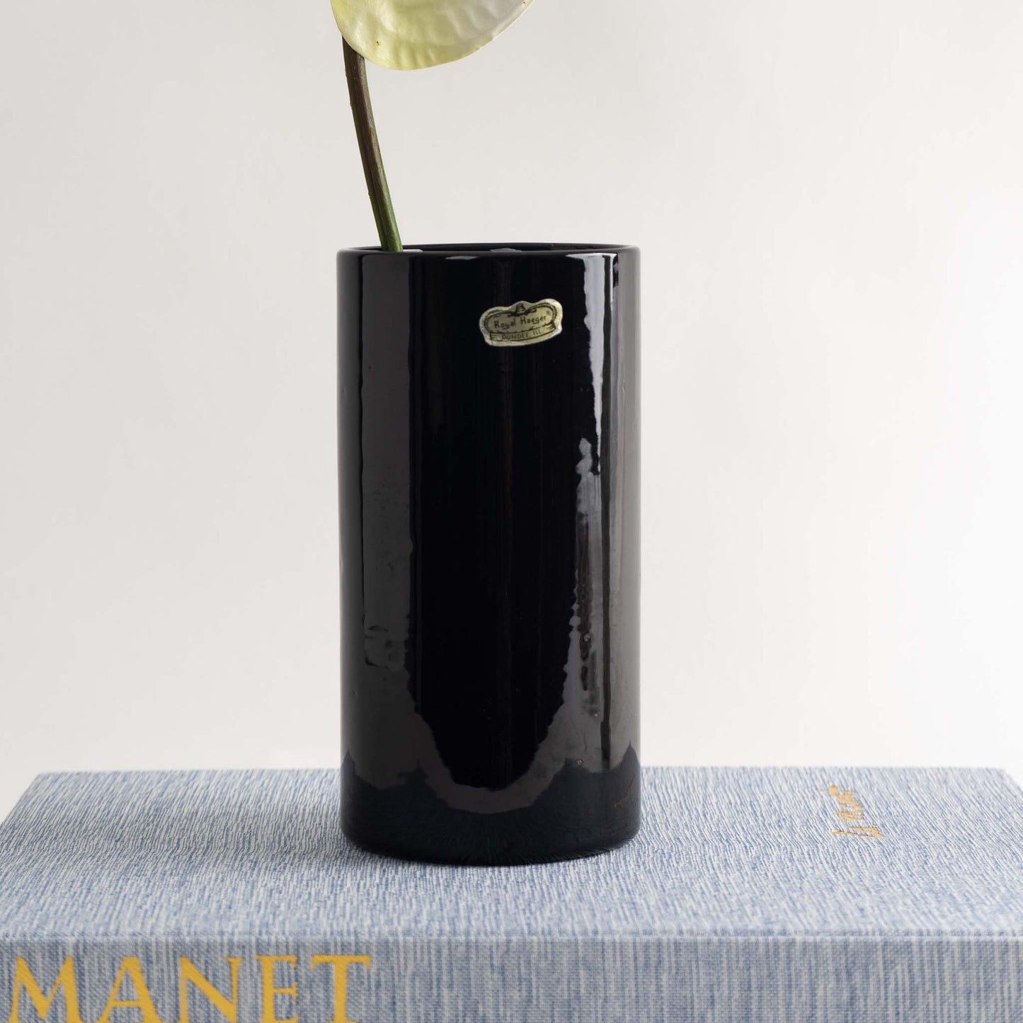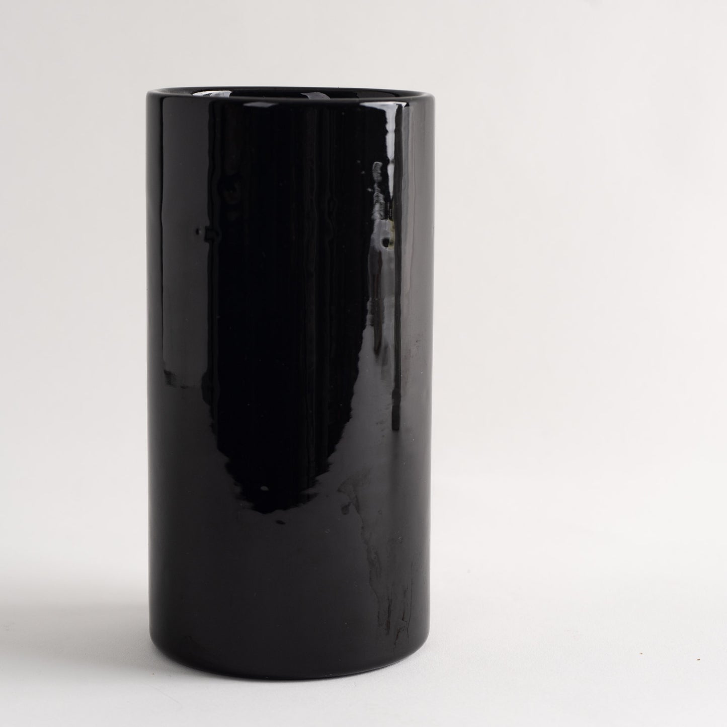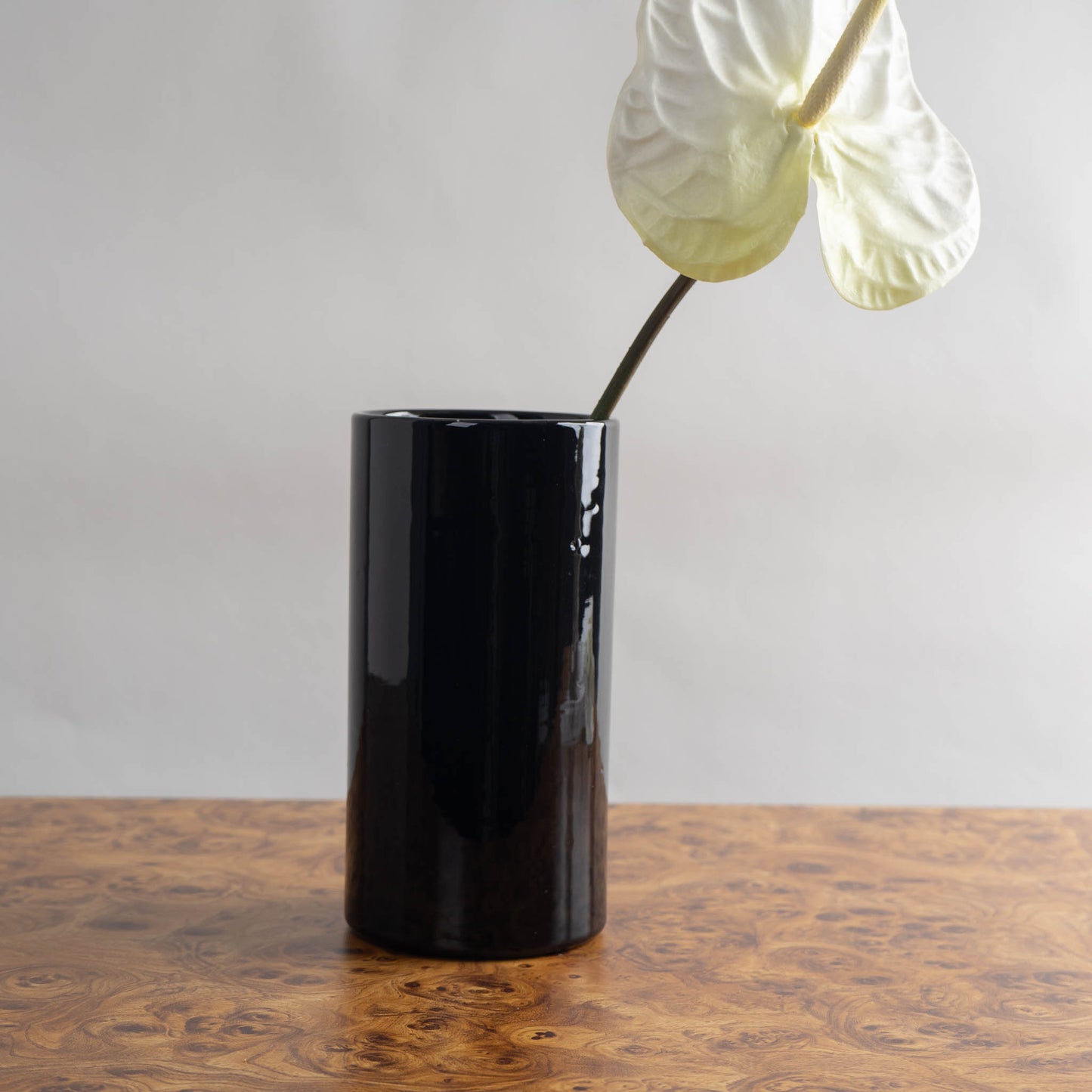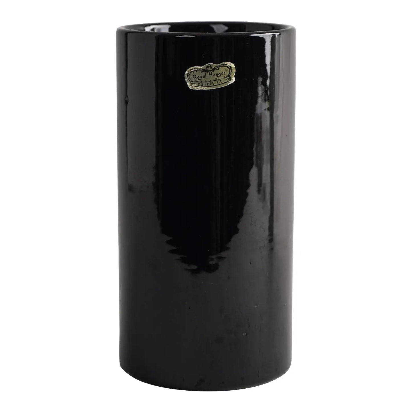 Classic black ceramic cylinder vase crafted by renowned maker Haeger. This timeless piece is ideal for showcasing flower arrangements or using as chic coffee table decor.