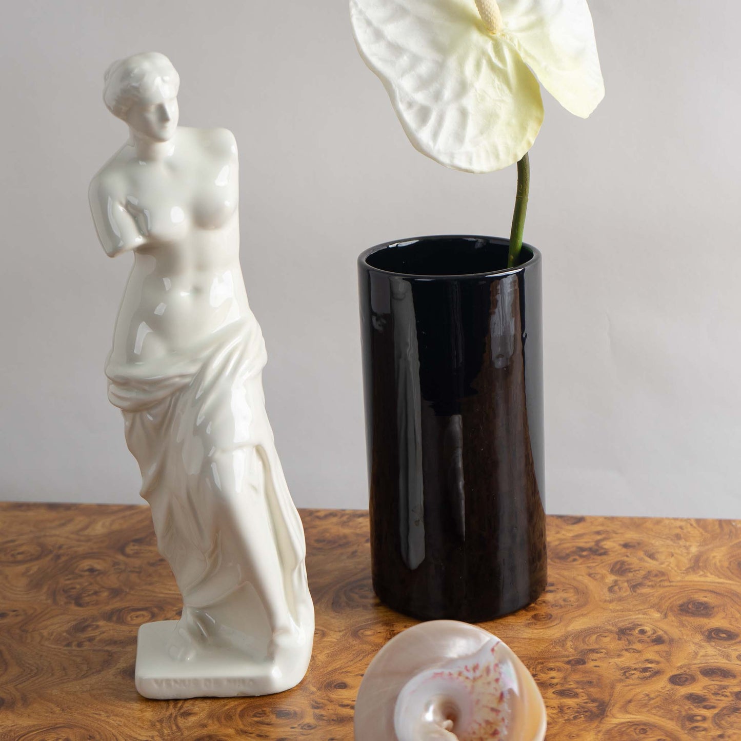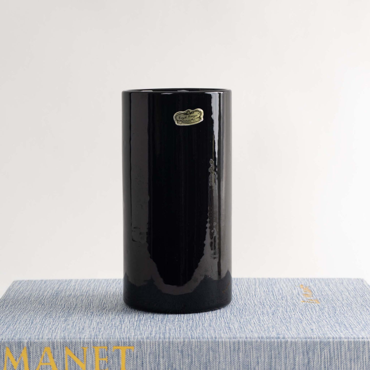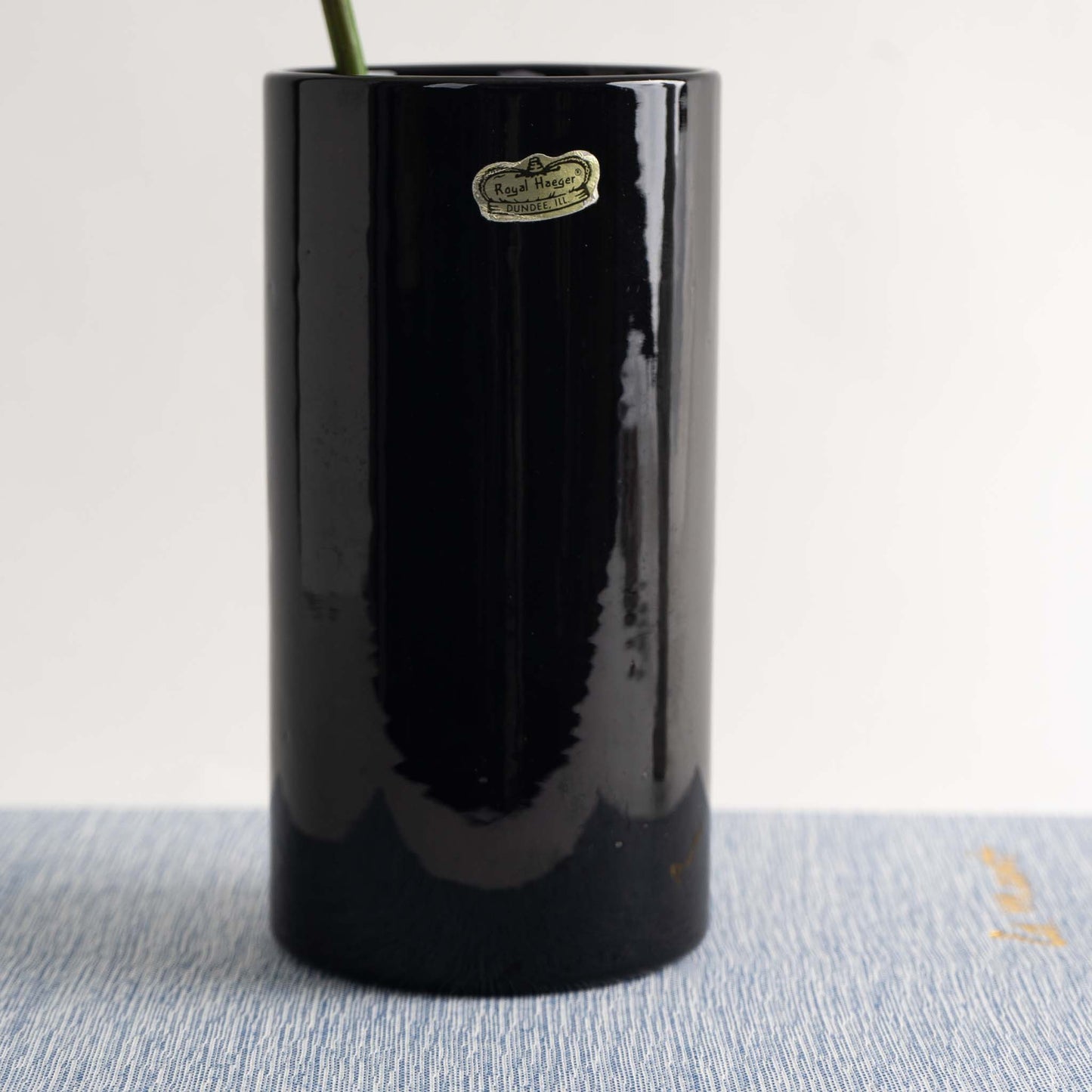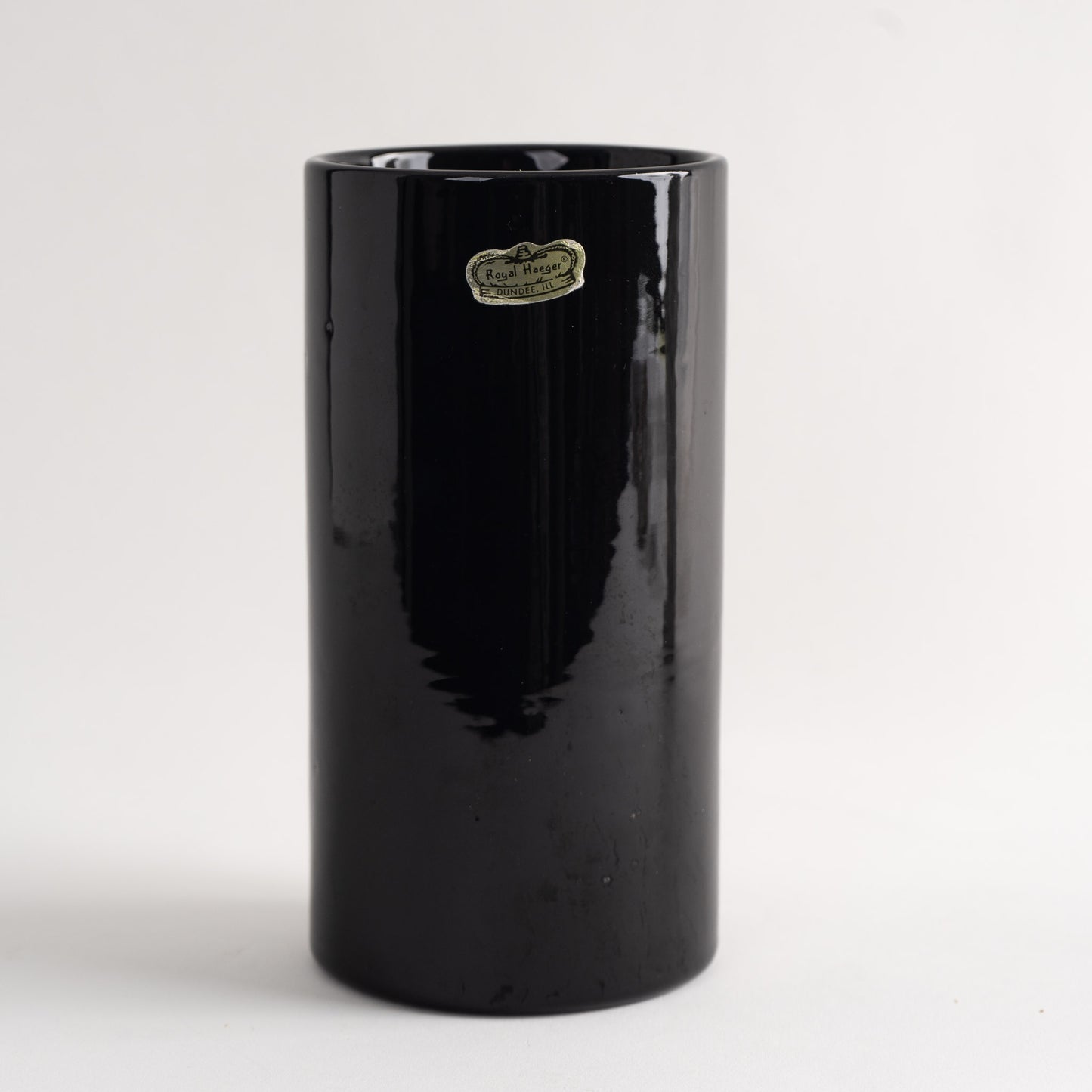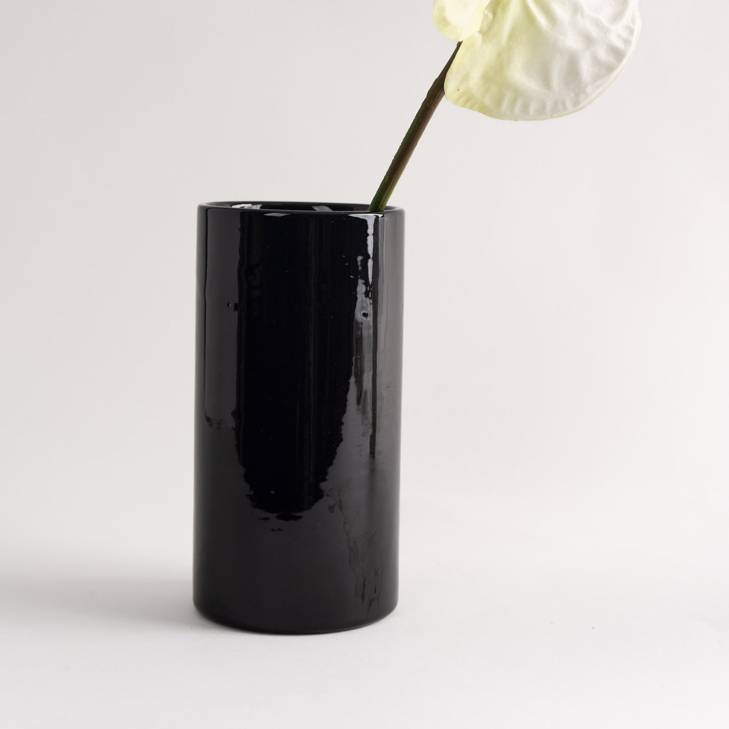 Classic black ceramic cylinder vase crafted by renowned maker Haeger. This timeless piece is ideal for showcasing flower arrangements or using as chic coffee table decor.